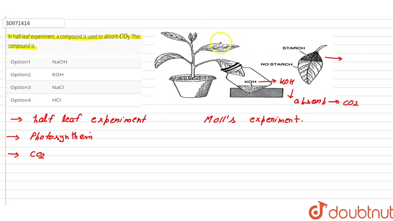 In half-leaf experiment, a compound is used to absorb `CO_(2)`. This compound is
