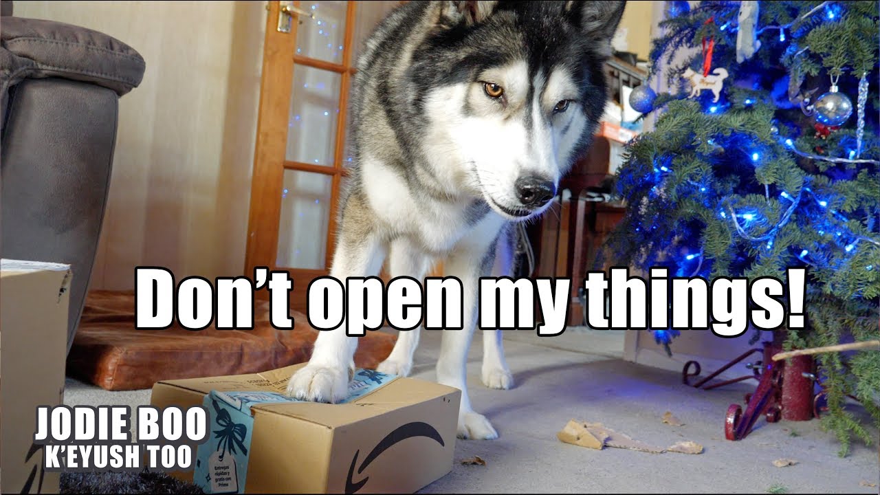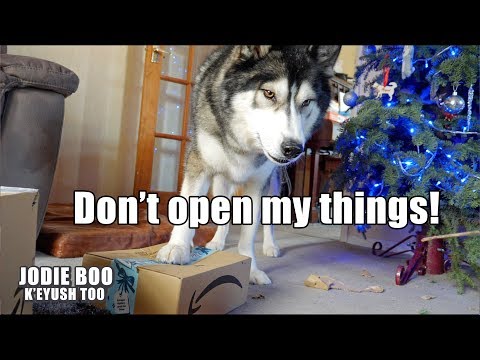 My Husky Won't Let Me Open Gifts! And Says Cutest Thank you! Part 1 of 2. Thank you Brian for the fish treats. Thank you Lauren for the clamp and vegan treats. Thank you Robby for the camera strap and gift card. Thank you Risenwolf18 for the goose toy. Thank you Clare for the card. Thank you Stitch for the fish toy. Thank you William for the treat selection. Thank you Daisy for the squeaky toy. Thank you Connor for the poop toy. Thank you gooddog.baddog for the fish cubes. Thank you Chaitali for the goodboy treats. Thank you whomever sent the top for me and also the hamper. Thank you Louise for the drawing of Key. Thank you Ali for the treats, antler and duck toy.