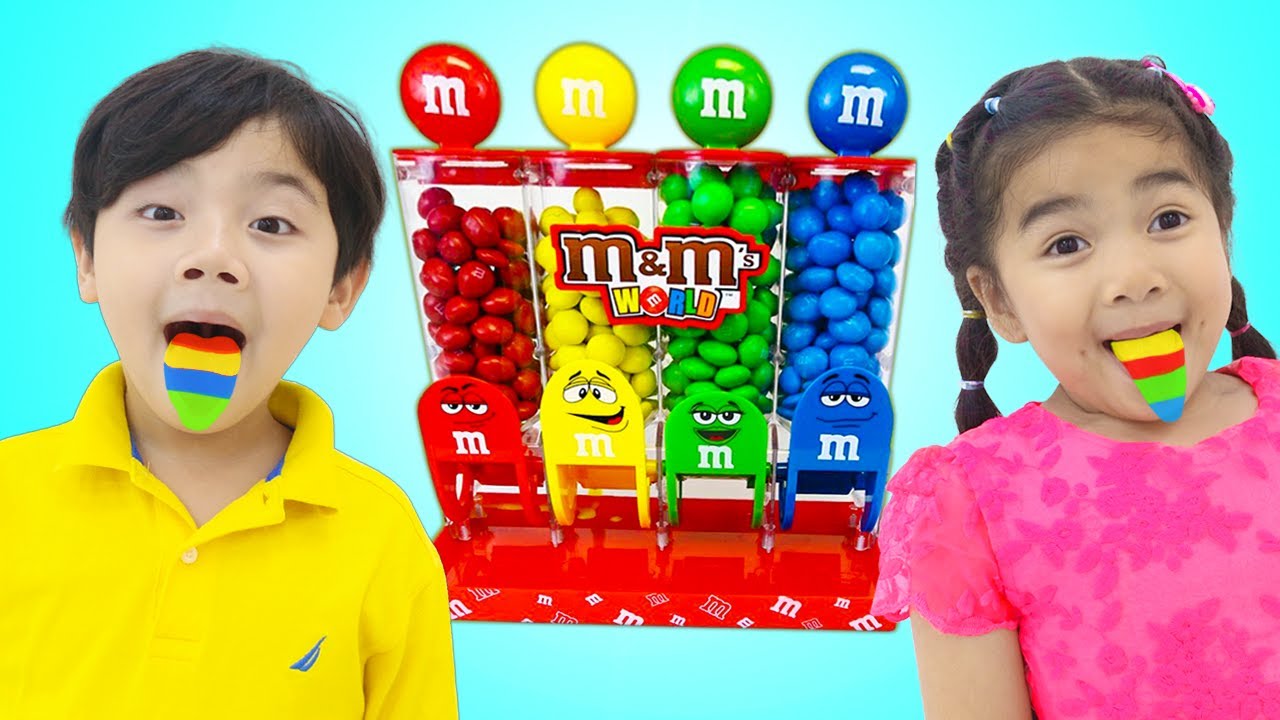 Suri and Sammy are having a fun time with the M&M chocolate candy machine!